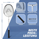 Badminton-Set für Spielspaß mit Familie & Freunden Dieses hochwertige Badminton-Set bietet alles, was Sie für eine unterhaltsame Partie benötigen. Es enthält zwei leichte Aluminiumschläger, die sowohl für Anfänger als auch für fortgeschrittene Spieler ideal geeignet sind. Zusätzlich sind zwei Federbälle sowie eine praktische Transporttasche im Set enthalten, sodass Sie es überallhin mitnehmen können. Dank der robusten Verarbeitung und des geringen Gewichts der Schläger liegt das Set gut in der Hand und ermöglicht präzise Schläge sowie lange Ballwechsel. Ob im Garten, im Park oder im Urlaub – mit diesem Set steht dem Spielspaß mit Freunden oder der Familie nichts im Weg. Besonders für Eltern mit Kindern ist es eine tolle Möglichkeit, sich gemeinsam sportlich zu betätigen und die Freude am Badminton zu entdecken. Perfekt für Freizeit- und Hobbyspieler, die eine unkomplizierte und unterhaltsame Aktivität suchen!