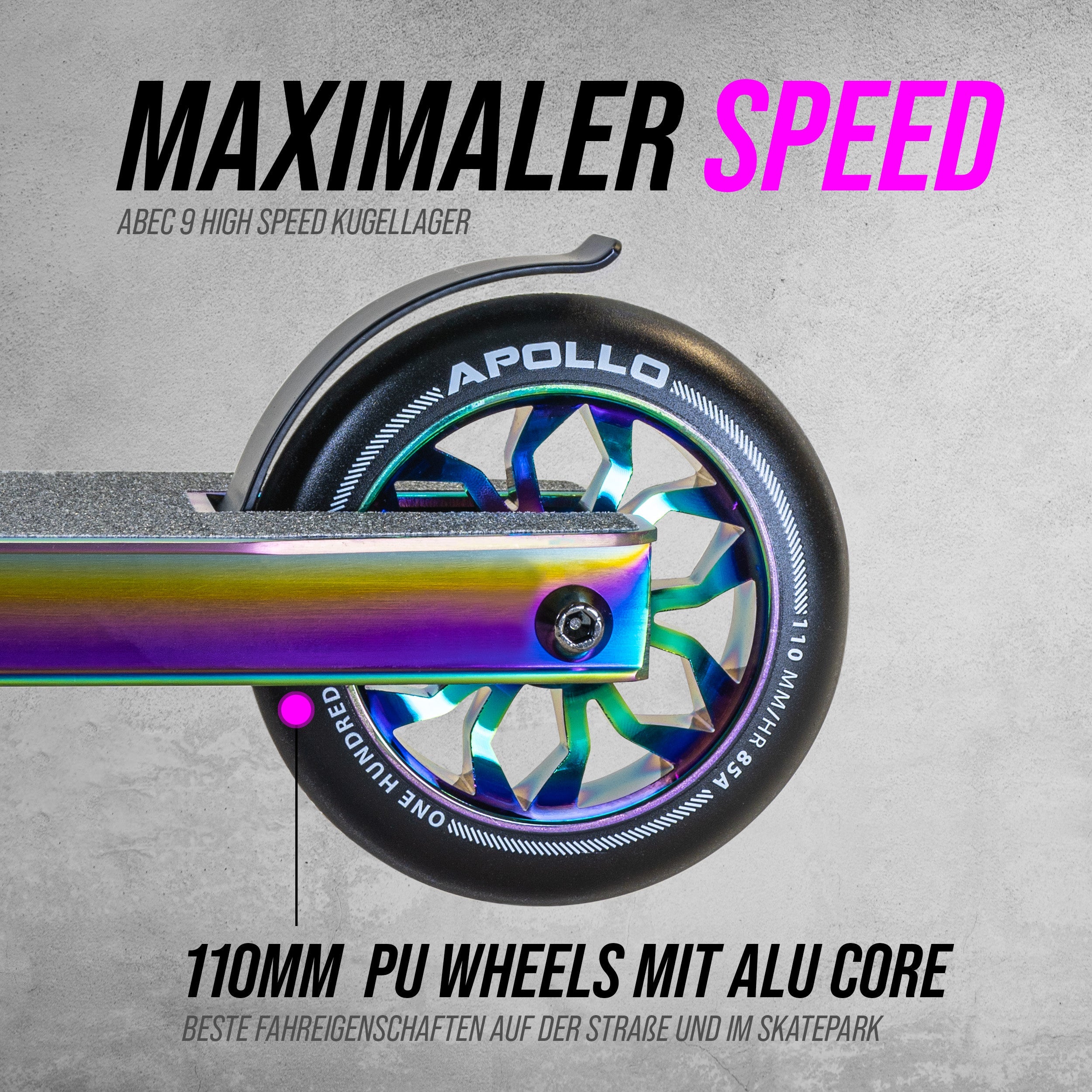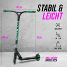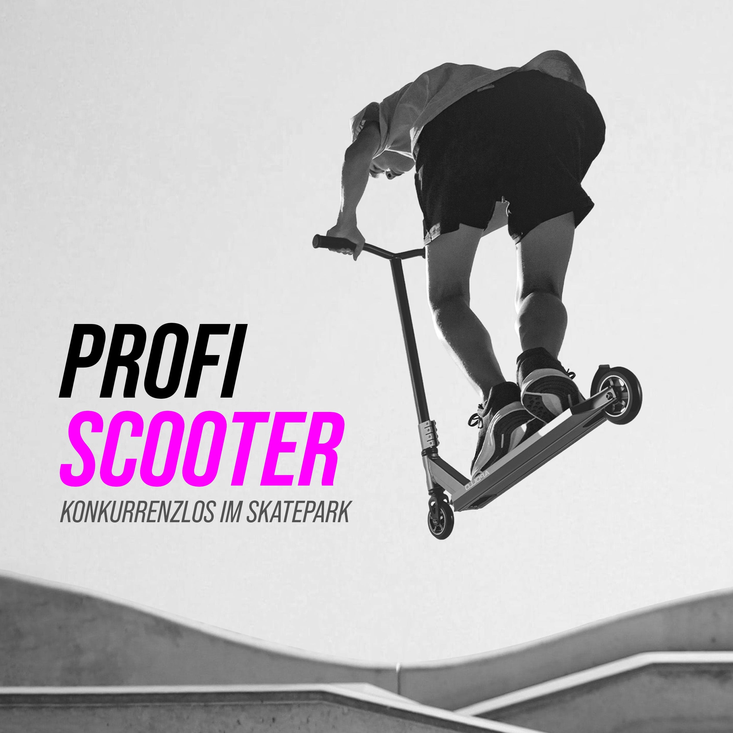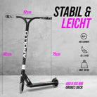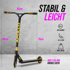 LIKE A PRO: Der Stuntroller Rahmen besteht aus HQ Aluminium, darüber hinaus verfügt der Scooter über 110mm PU-Scooter Rollen mit Alu Core & ABEC 9 High Speed Kugellager.