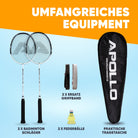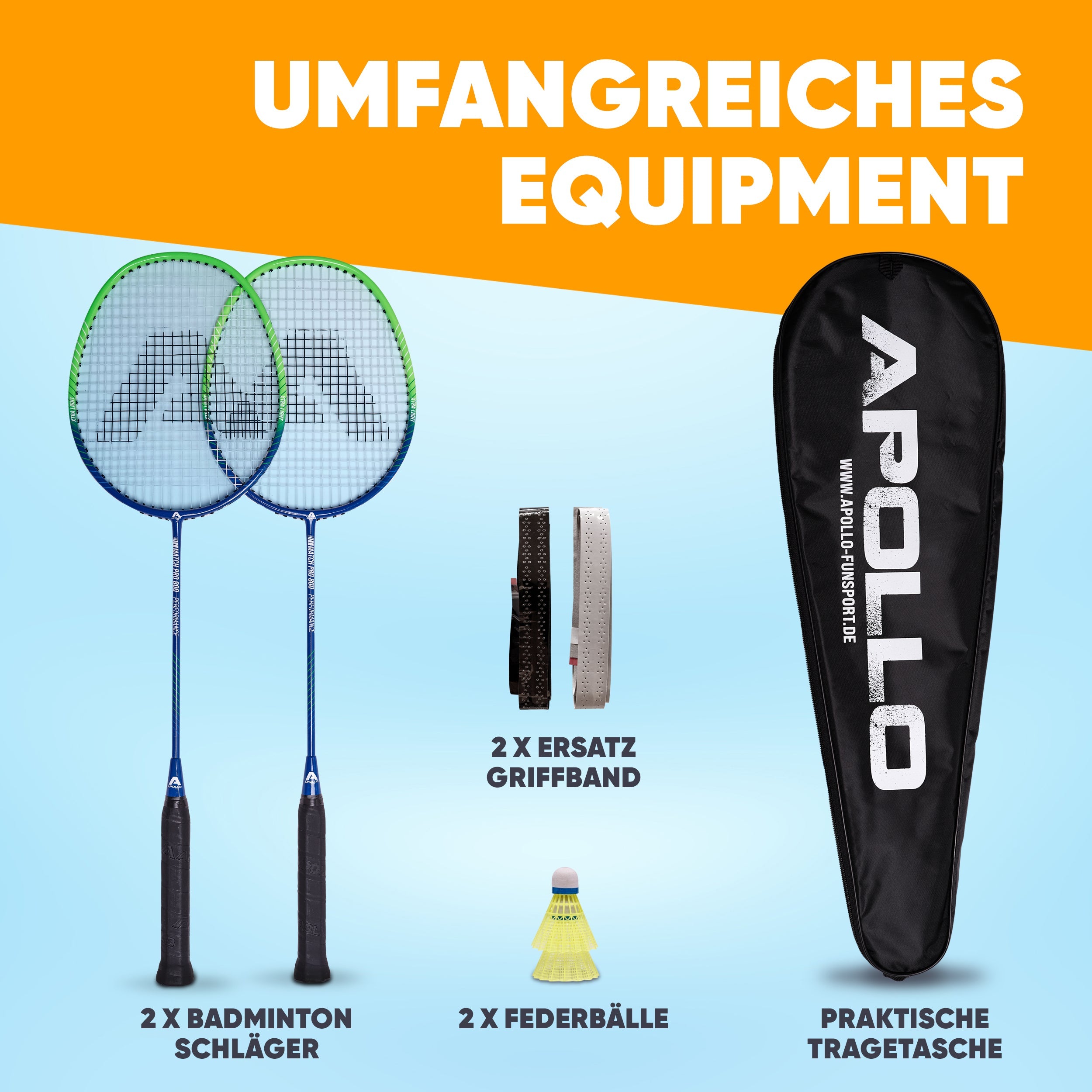 Das Badminton Set beinhaltet 2 Badmintonschläger, 2 Bälle und eine hochwertige Tragetasche. So kann das Federball Set einfach überall mit hingenommen oder nach dem Spiel platzsparend verstaut werden.