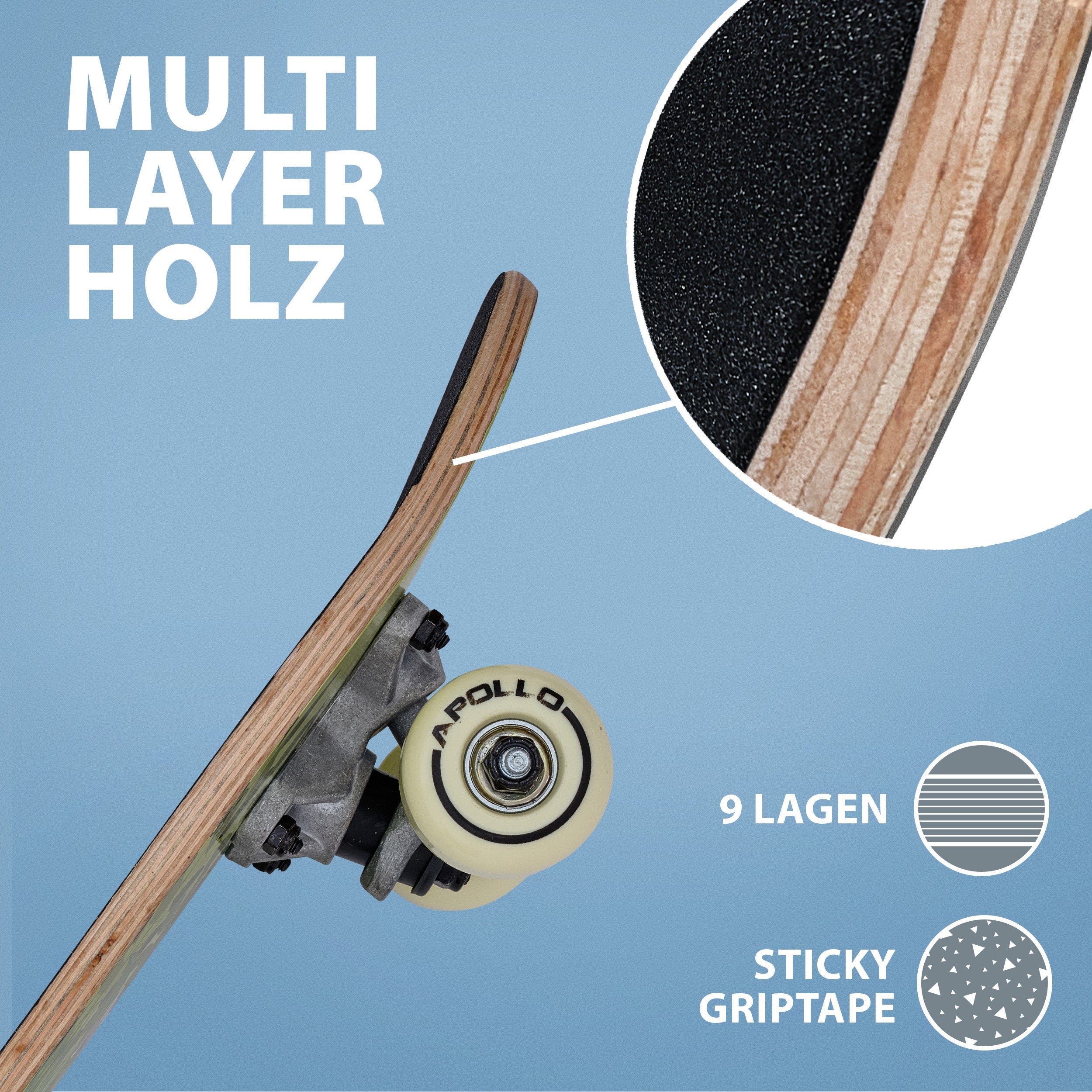 Das brandneue Apollo Komplettboard für Kinder. Unsere Einsteiger / Kinder Skateboards sind mit rutschfestem Griptape, farbigen PUC Rollen, ABEC 3 Kugellagern und hochwertiger Aluminium Achse ausgestattet.
